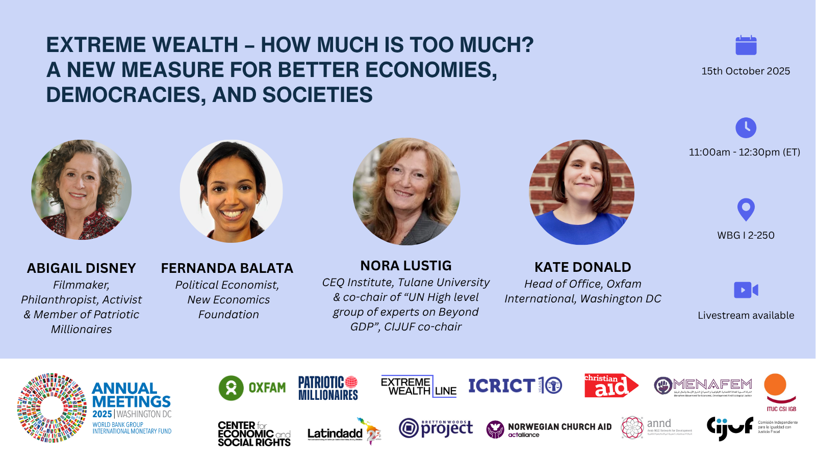 Abigail Disney, Fernanda Balata, and Nora Lustig discuss a new measure for better economies, democracies, and societies at the World Bank IMF's Civil Society Policy Forum.